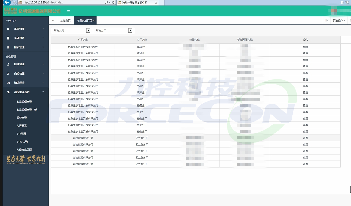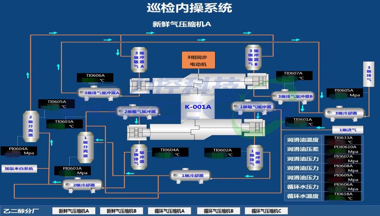 本次項目的實施范圍覆蓋庫布齊園區生產基地3個分廠,共計43條巡檢路線。內操巡檢平臺則主要是針對這43條路線中的重點巡檢路線上重點裝置,設備和重大危險源進行集中監控管理。監控畫面35幅,監控點位360余個。系統依托pSpace實時數據庫平臺,自動記錄各測控點位的實時數據。并根據工藝要求,配置各測點的報警信息。智能巡檢平臺通過標準接口實時讀取pSpace數據庫中各監控點位產生的報警信息。并將報警信息與現場監控視頻綁定。當報警產生后,視頻監控自動切換到對應的巡檢點監控畫面。同時智能巡檢平臺能對各巡檢點產生的報警信息進行統計分析,為現場檢修人員制定設備保養計劃提供數據支撐。除此之外,利用Html5技術,根據Fsmartworx的跨平臺特點,實現內操巡檢系統與智能巡檢平臺的融合。