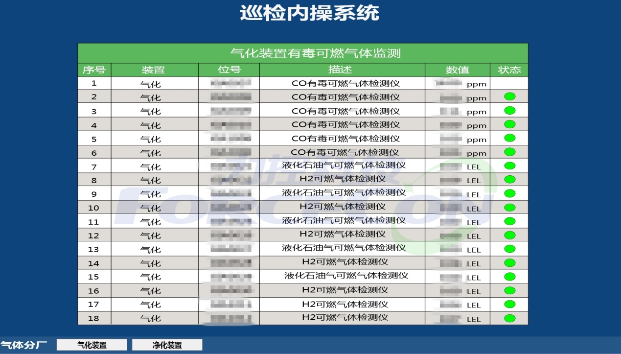 有毒可燃氣體的監測是安全環保的重中之重,也是安全生產的保障。本項目中采用表格形式,直觀展示各個有毒可燃氣體檢測點的氣體濃度值。并根據濃度閾值,以不同顏色顯示。實現有毒可燃氣體濃度的集中管理。