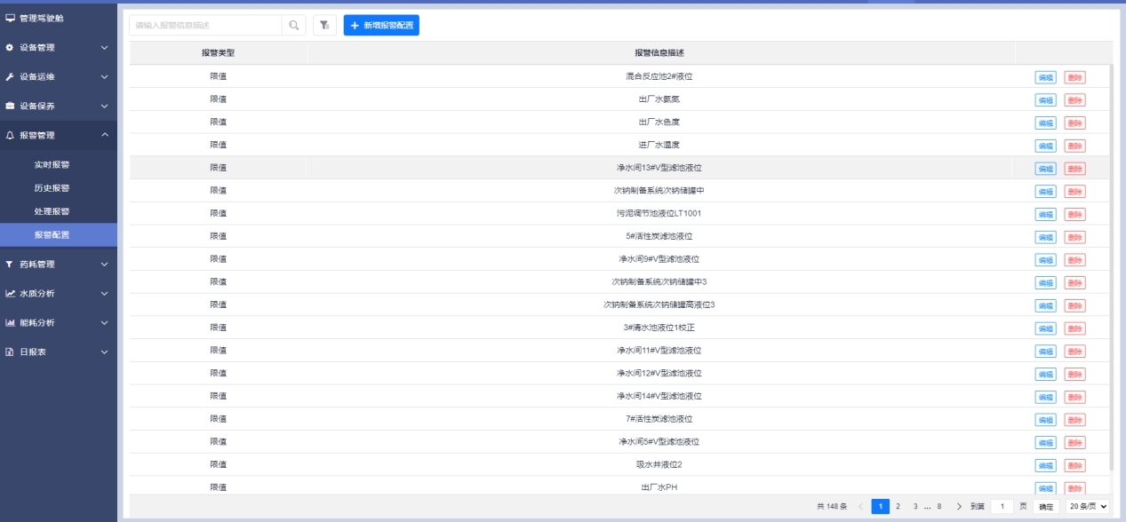 能夠按照測點靈活配置廠區(qū)生產運行過程中設備及工藝流程參數(shù)的報警產生規(guī)則、如限值報警、開關報警、組合報警等規(guī)則,按照配置的測點信息填寫報警描述,如水質異常、壓力異常等報警描述。