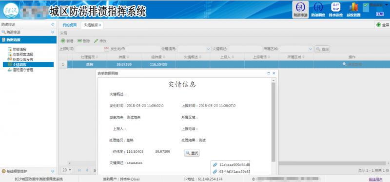 汛情發(fā)生后,通過已被調(diào)度的各個模塊來對事故進行處理,合理安排泵站的抽排水、搶險車輛和搶險隊伍等對人員物資的搶救,按照應(yīng)急預案有條不紊的應(yīng)對各種突發(fā)事故。對已經(jīng)完成的搶險救災任務(wù)形成簡報,地圖展示位置信息,可查看處理結(jié)果,對搶險救災任務(wù)進行總結(jié),用最優(yōu)的措施保障人民生命財產(chǎn)安全。
