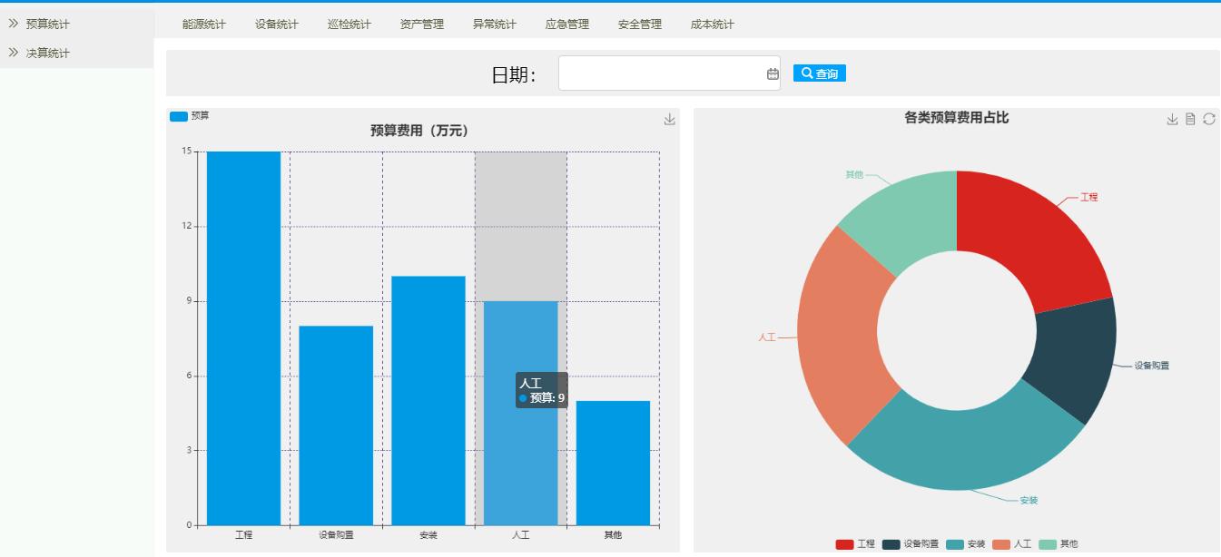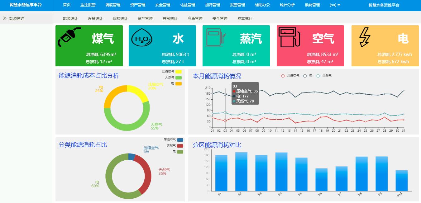 建立藥耗控制與分析系統,可根據采集的信息提前計算生產需要的碳源、PAC等藥劑的投加量,加藥前后指標變化趨勢,并進行加藥自動控制,并可分析出任意時間段內各單元的藥耗,生成日報、月報、年報。可實現對藥耗生產運行成本進行分析控制和藥劑管理。對用能分類分項進行同環比分析,以棒圖、餅圖、報表等形式展示,讓用戶更直觀、快速地了解藥耗信息。
