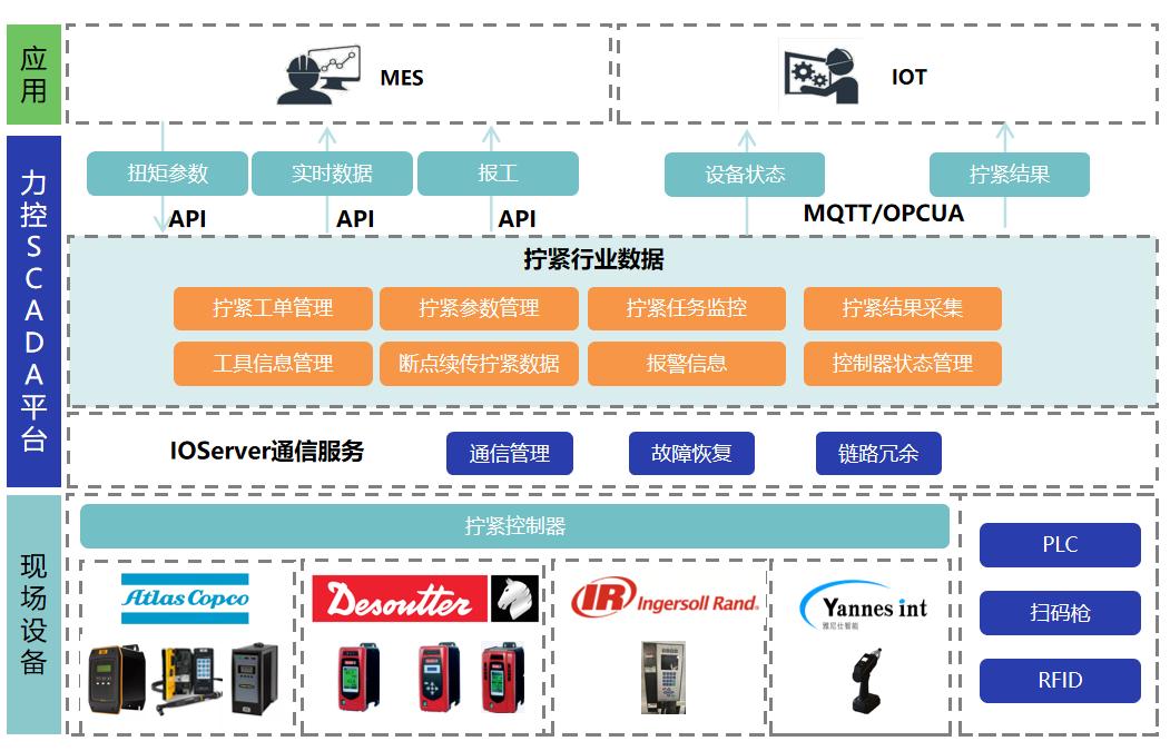 力控SCADA基于OpenProtocol通信驅動、強大的數據處理、靈活的腳本和可視化等各種組態能力,系統能統一管理裝配線上的工藝參數、工具狀態、擰緊結果、報警信息與運行數據,支持MES工單接收、扭矩參數下發和自動報工,實現了與MES系統的雙向集成。該架構有效打通設備同MES和IOT平臺的數據通路,為生產全過程追溯與工藝分析提供可靠數據基礎,有力支撐了工廠裝配產線的全自動化升級改造。