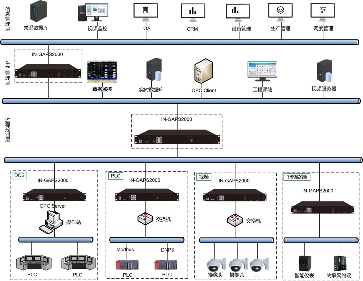 IN-GAPS 2000部署在信息管理層與生產管理層之間,用來阻止來自信息網的DOS/DDOS攻擊、惡意掃描、異常數據包等安全威脅;可對通用網絡協議進行訪問控制和安全過濾,并且支持對工控主流協議進行訪問控制及深度解析,可以限制只有可信任的數據能夠在工控網絡中傳輸,有效保護了工控網絡的安全。