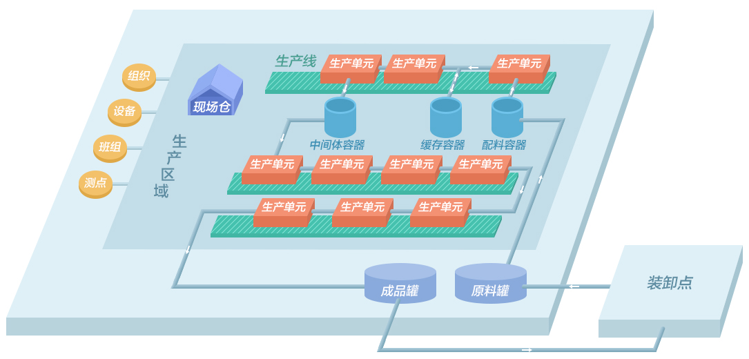 建立基于工廠生產的數據基礎模型,實現生產裝置、計量點、物料、裝卸點、儲罐、倉庫、生產節點、測點、班次工廠基礎信息模型組態,來支撐MES系統中各生產業務功能模塊。 需通過工廠建模對工廠生產所涉及的人員信息、班組信息、物料信息、裝置信息、儲罐信息、進出廠點、計量點等生產元素進行定義和規范化管理,以信息化手段構建工廠生產重要主數據。 工廠模型從生產裝置、計量點、物料、裝卸點、儲罐、測點、生產節點、能源節點、班次、路由多維度構建工廠主數據模型,來支撐上層應用業務。